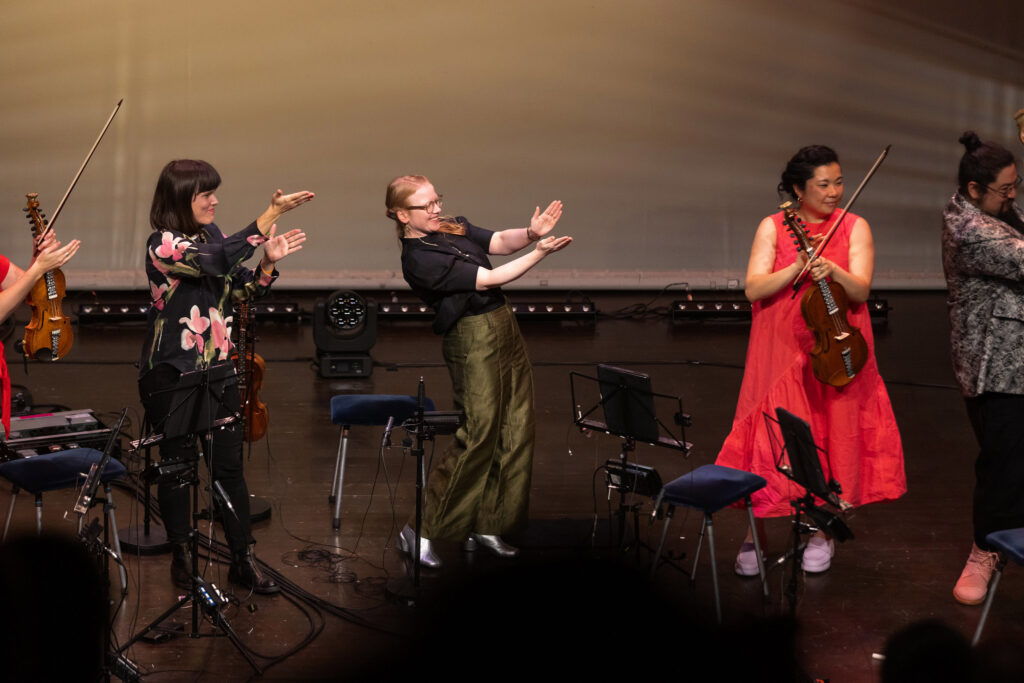 Benedicte Maurseth, Kristine Gjøgersen og Kronos tar applaus etter fremføringen av Elja. Foto: Nabeeh Samaan/Ultima