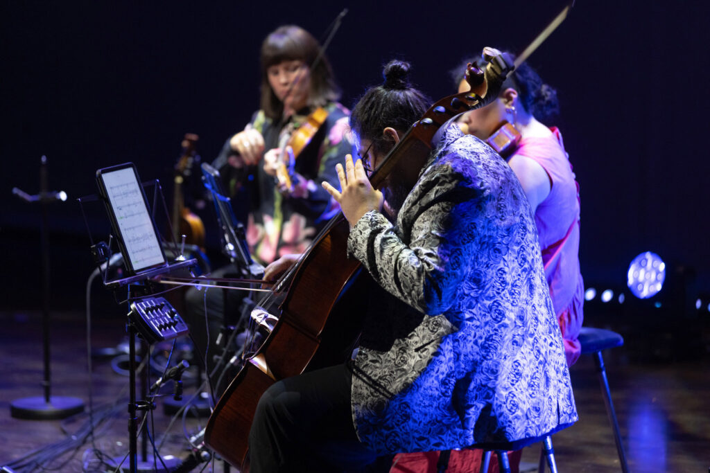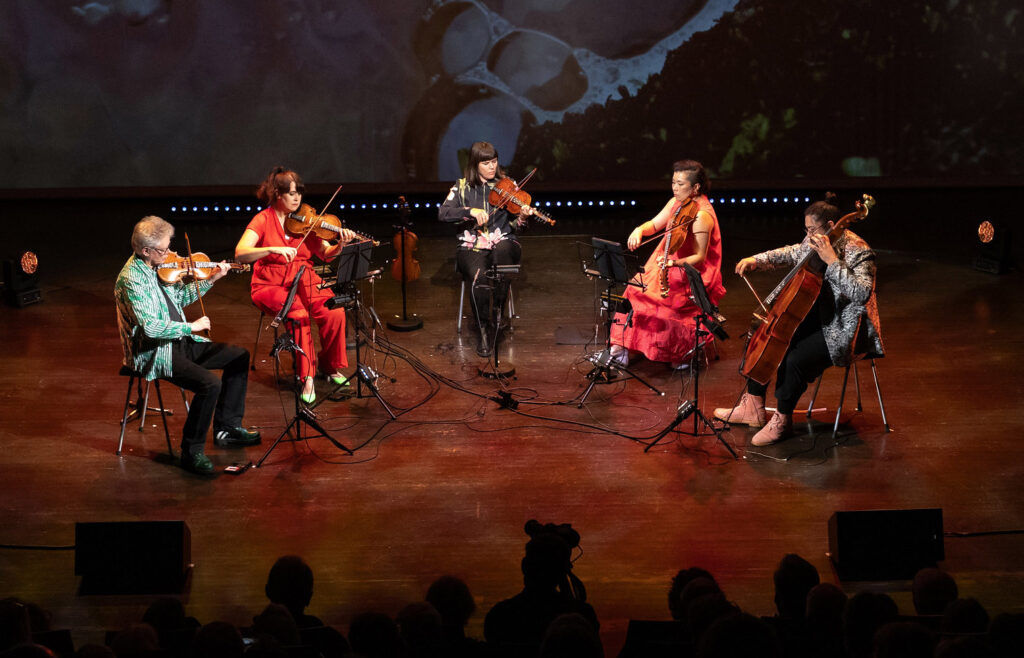 Kronos-kvartetten, som ble etablert i San Fransisco i 1973, har vel et mer uanstrengt forhold til dette enn de fleste. De kan se ut som et band fra den yrende protopunk/new wave/no wave-scenen i New York rundt 70-80-tallet, og de har da også jobbet med mange nøkkelskikkelser fra denne perioden. Fiolinist David Harrington er det eneste originalmedlemmet igjen, og hans sobre, avslappede stil kunne like gjerne tilhørt det jeg kaller en grafikk-rocker, mens fiolinist Gabriela Díaz, bratsjist Ayane Kozasa og cellist Paul Wiancko fyller ut typegalleriet – fra topp til tå: Semskede rosa boots (Wiancko), flaskegrønne bowling-aktige sko (Harrington) og limegrønne pensko (Díaz). Om du for eksempel så dem reke uti Torvald Meyers gate, på jakt etter et egnet sted å bruke buyout-budsjettet sitt, skulle jeg klart å lure deg til å tro at det var medlemmer av The Magnetic Fields. Og i denne sammenhengen blir vel også de Kåsa-bygde instrumentene de for anledningen spiller på, seende ut som noe som like gjerne kunne kommet fra fremtiden.