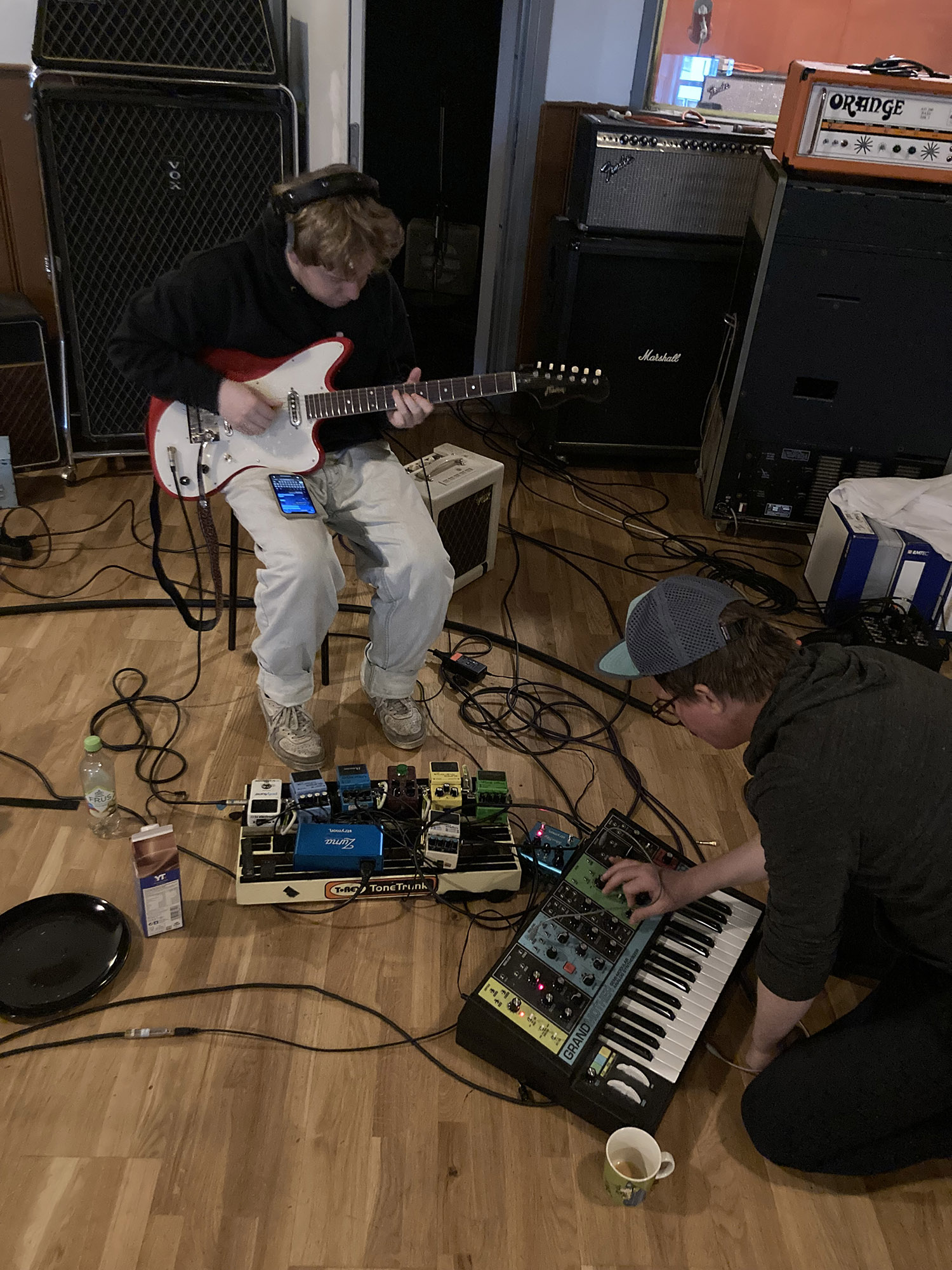 – Nå skal du høre. Annenhvert år har jeg Death Cab-kick. Under ett av disse kickene sto jeg på øverommet, og jeg tenkte, hva gjør Chris Walla nå? Jeg googlet, og der sto det at han bodde i Tromsø. Hva faen? Så jeg sendte ham en DM på Twitter, dette var lenge siden, før Elon kom og ødela alt. Jeg introduserte meg spurte hvorfor han bodde her, og om om han drev med musikk. Så svarte han meg, og oppfordret meg til å sende ham greiene mine. På den tiden hadde han flyttet til Trondheim. Han var fremdeles produsent for band fra indie-verden i USA, i tillegg til noen lokale ting. Så tok det tid på grunn av alt mulig pga covid, men etter mye om og men, skulle vi spille inn denne plata, og vi avtalte å møtes på zoom eller lignende. Jeg fortalte ham greia, viste musikken. Walla er verdens minst gatekeeper-aktige type, han er veldig opptatt av å sjekke ut ny musikk. Jeg vet ikke i hvor stor grad han ønsker å etablere seg i norsk musikkliv, men jeg tror han syntes det var litt gøy å jobbe med noen herfra. Det var også praktisk, sammenlignet med å for eksempel skulle dra til Seattle. Så han gikk med på en avtale som var utrolig gavmild, økonomisk sett. Jeg trodde ikke han skulle gjøre det, og det var en viktig validering for min del. Så sendte jeg sendte emo-demoene som jeg kalte dem, veldig skranglete ting preget av at jeg er sykt dårlig på å spille inn ting i Logic. Men han fikk heldigvis også et liveopptak der vi spilte alle fire, og så hadde vi dialog fram mot studio. Han ville gjøre så mye live som mulig og heller fargelegge ting etterpå. I studio var han super-påskrudd. Vi var i Martins kontrollrom på Paradiso, som er mindre enn de store mikserommene, men man har tilgang på de samme innspillingsrommene. Jeg tror vi hadde 16 linjer som vi kunne bruke, innspillingen fikk en fin undergrunnsfølelse. Han var sykt nøye, men lot oss styre, var ikke bastant, men hadde respekt for hvordan jeg ønsket det skulle være – og så kom han med mange innspill, tips, hvordan man skulle løse lydting. Vi prøvde masse forskjellige mikrofoner, vi ampet og re-ampet gitarene, vi prøvde trommene ute i det store rommet, som ikke brukes så mye i Paradiso nå for tiden. Mens jeg sto inne i tromme-boothen, spilte kontrabass og sang… det var fem dager med sykt gøy, kreativt arbeid. En av dagene kunne ikke Axel være med i studio – da skulle vi spille inn “Hold øyene lukka”. Vi spilte inn første delen uten trommer, på klikk. Så kom vi på, kan vi ikke bruke trommemaskin? Vi fant noe gammal digital drit som lå i studioet og satt og jobbet med det. Så kom Axel, og etter første refrenget kommer han og tar over for maskinen, ødelegger den. Det er et av høydepunktene på plata.
