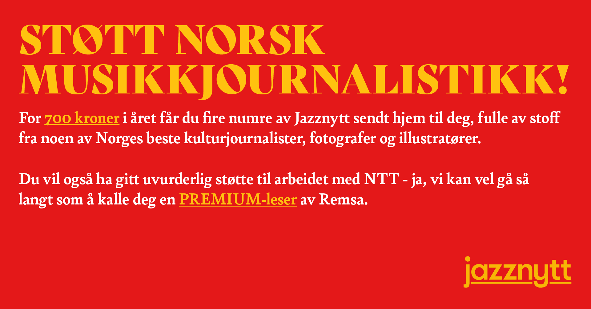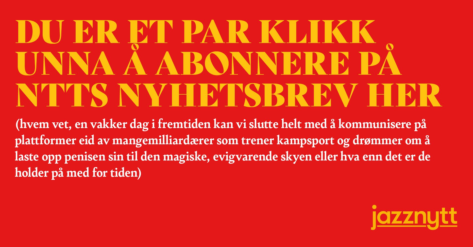 Now’s The Time er en gratis ukentlig musikkavis. Vil du hjelpe oss i arbeidet, er vi glade for om du sprer ordet, eller simpelthen diskuterer noe av innholdet, og går på en og annen konsert. Vi er også glade for alle som melder seg på nyhetsbrevet vårt, som sørger for at hver eneste utgave kommer rett ned i din digitale postkasse på fredagene. Den tjenesten kan du melde deg på her. Om du virkelig vil utgjøre en forskjell og bli det vi kaller en pluss-leser av NTT, anbefaler vi å tegne et Jazznytt-abonnement. Og om du savner at vi skriver om en konsert eller en festival eller et album eller et tema, eller om du bare har lyst til å gi oss refs eller ros, har vi epost. Du kan for eksempel fyre av en mail til filip.roshauw@gmail.com eller audun@jazznytt.no