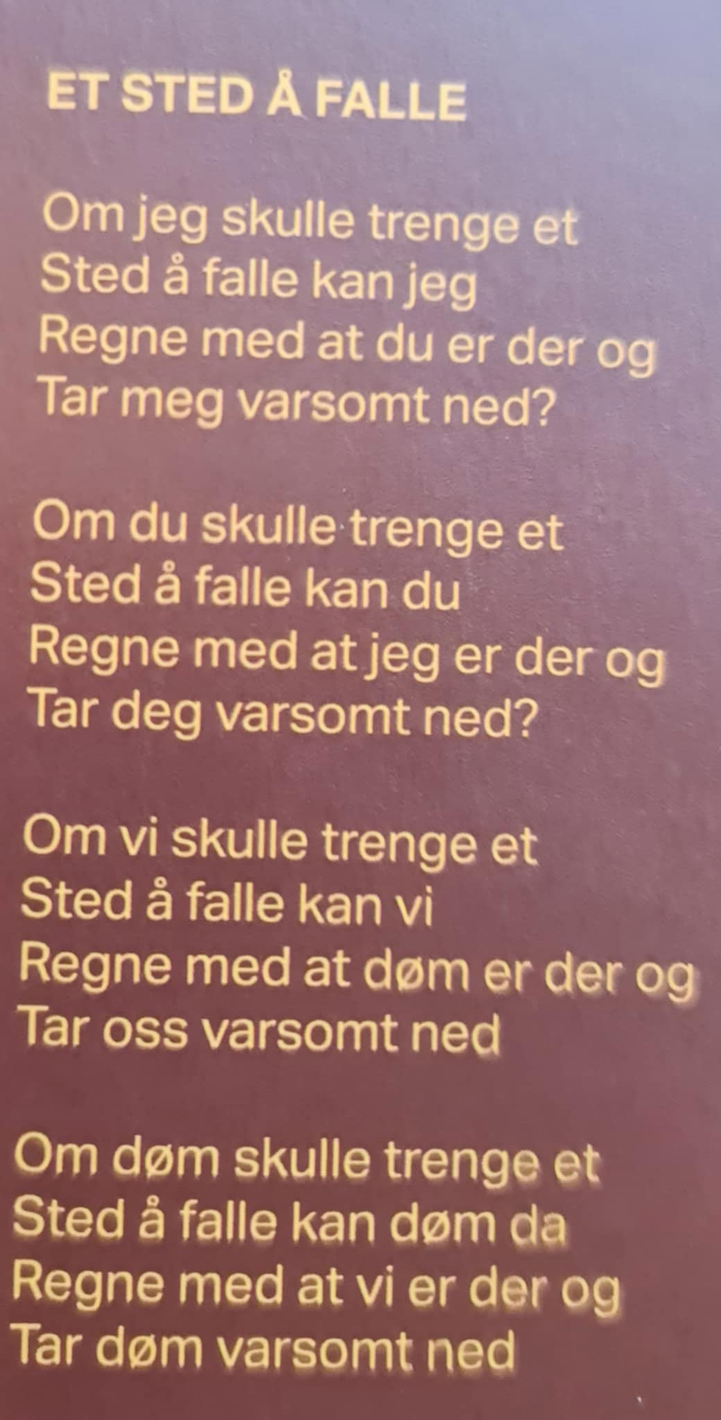 Helt til slutt kommer i stedet den uutholdelig vakre “Et Sted å Falle”. Gutta er tomme for spydighet, tomme for lister å ramse opp, og spør ganske enkelt om solidaritet fortsatt finnes, personlig eller internasjonalt. Er du der for meg? Er jeg der for deg? Er vi der for dem? Er de der for oss? Underforstått: Kan de være der for oss dersom vi ikke er der for dem? Hva er det vi holder på med? Hva ER det vi holder på med? Når raseriutbruddet er over og man løfter blikket ut mot verden, hva har man igjen? Vissheten om at rett finnes gjør uretten desto mer uutholdelig, men siste ord kan ikke være hardt. Siste ord må være mykt, en implisitt bønn om hjelp. Vi i er i ferd med å gå fra vettet og vi har bare hverandre.