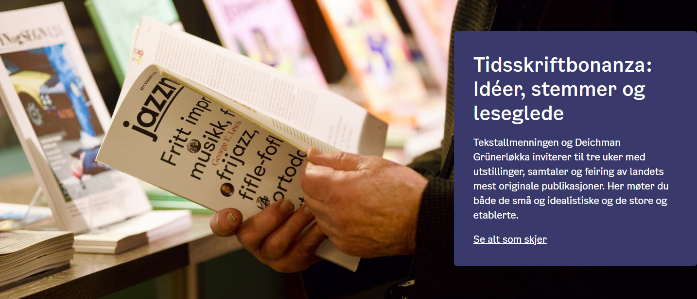 I Oslo arrangeres for tiden festivalen Tidsskriftbonanza, som blir beskrevet slik «Tekstallmenningen og Deichman Grünerløkka inviterer til tre uker med utstillinger, samtaler og feiring av landets mest originale publikasjoner. Her møter du både de små og idealistiske og de store og etablerte.». Det er utstilling og en rekke interessante arrangementer om litteratur, kunst og samfunn. Merk også Ballades arrangement med kult-heltene Sid Griffin og Peter Case, kjent fra band som The Plimsouls og The Long Ryders.