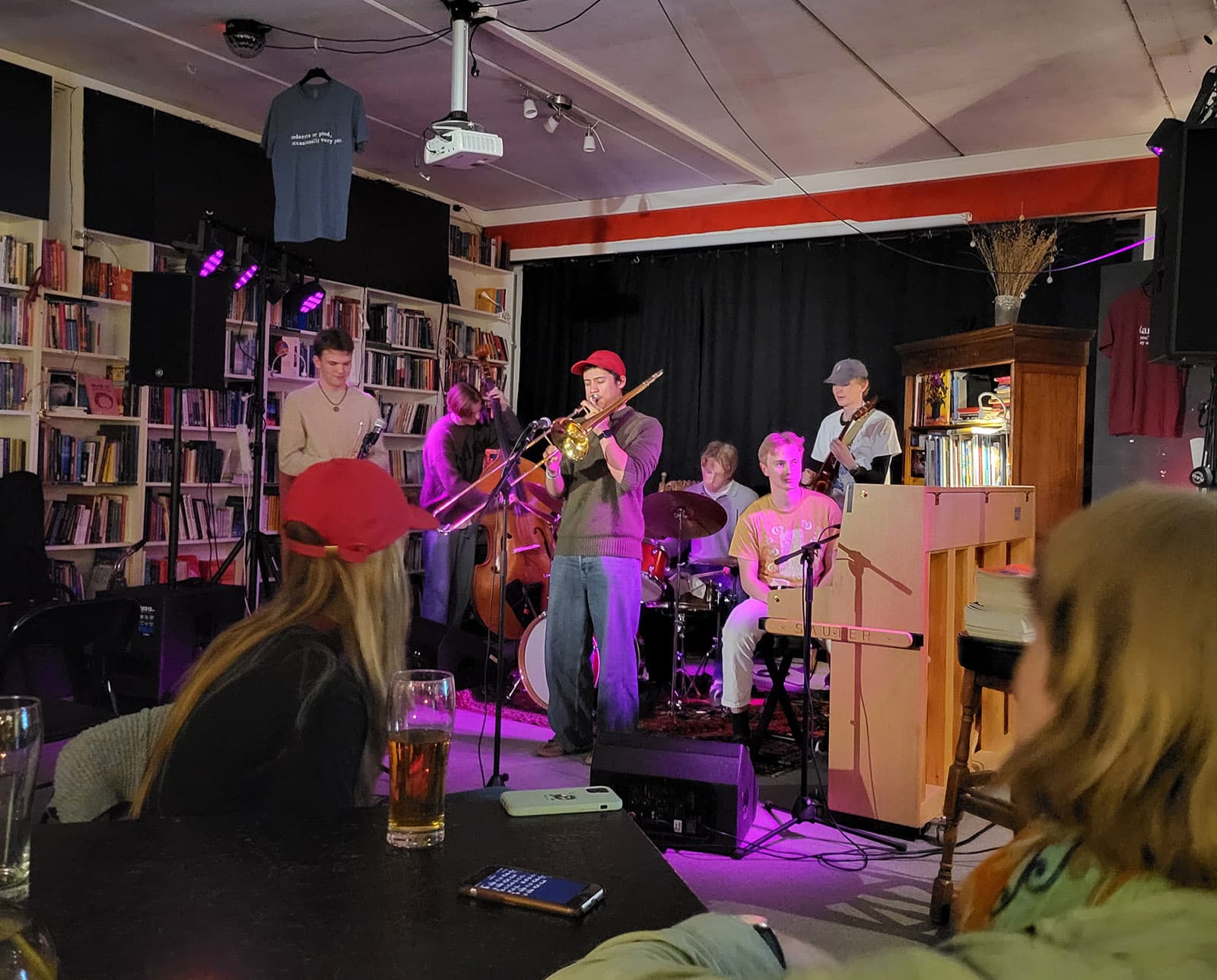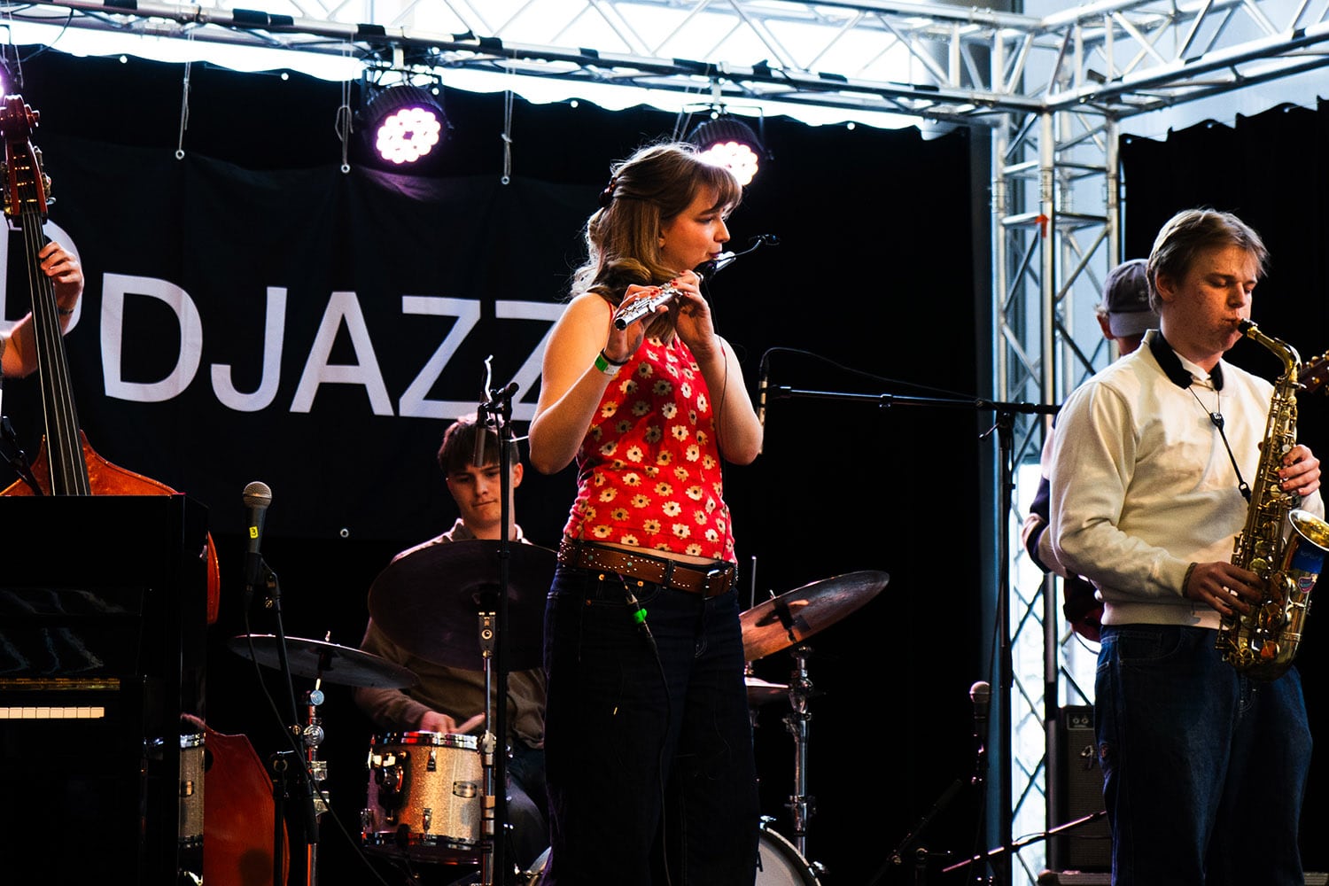 Men nok om det. Årets Sund-band med elever som får ha med seg en voksenperson, i år i form av vibrafonmester Amund Storløkken Åse, var bandet Røyst. Og dette låt tidvis veldig folkehøgskole-aktig og med artige låttitler, med luftige tær og hippie-vibes fra slik det låt i svenske viseprog-gymsaler en gang på søttitallet, eventuelt på min egen lokale Vestoppland Folkehøgskole i sin tid. Groovy folk og jazz, så klart med en fløyte i lydbildet, fra Evelina Innervik som jeg tidligere har omtalt som «et muntrasjonsråd med en viss Guro Kvåle Energy-aktig vibe». Hun har visstnok kommet inn på Jazzlinja i Trondheim til høsten, så det blir antakelig mulig å høre henne flere ganger.