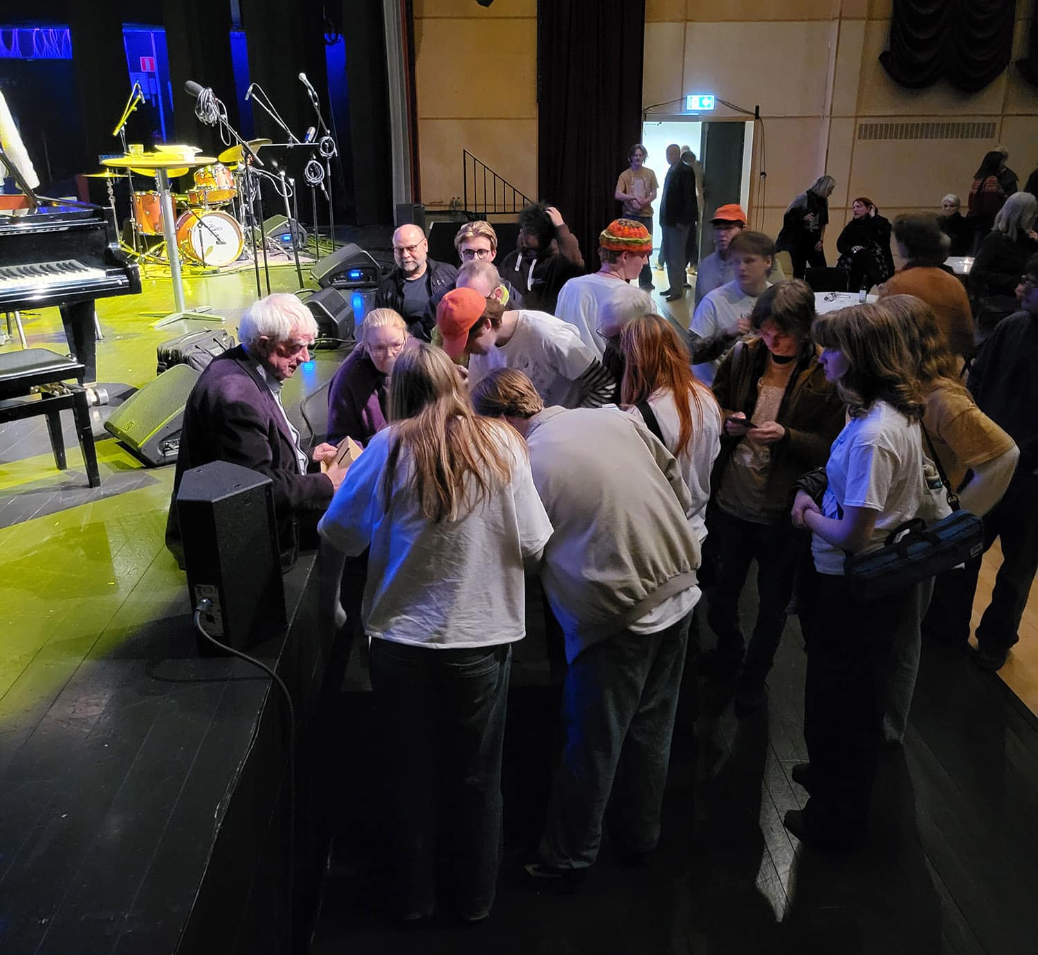 Det er likevel egentlig ingen grunn til at disse elevene på Sund kjenner til hans livsverk (av de grunner jeg var innom i innledningen her), men de forstår at han er legende, og hører det også. Etter konserten flokker de seg rundt ham for å sjekke ut de mange CD-ene han har med seg i kofferten han sleper med seg på hver spillejobb.