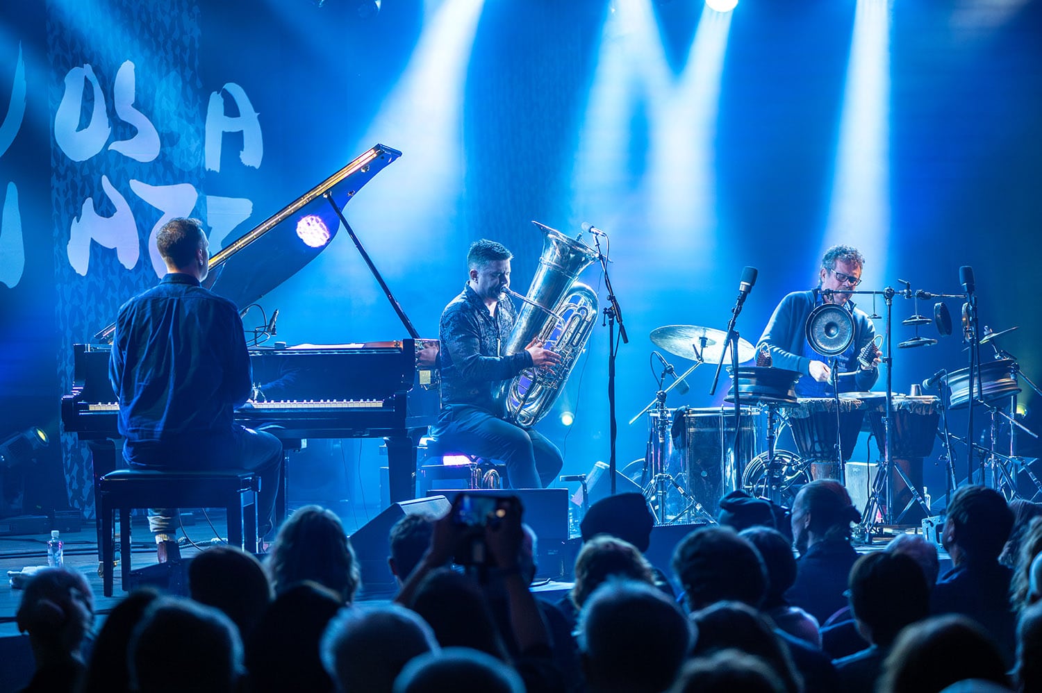 Daniel Herskedal og hans forskjellige tuba kan markere tiårsjubileum for trioen som består av Eyolf Dale på tryllepiano og Helge Andreas Norbakken på sublimt bilopphøggeri-perkusjon. Glimrende musikere alle tre. Også dette ganske perfekt i Vossa-salen, Herskedals tuba har merkelig nok elementer av både lur og bukkehorn i seg, og føles dermed lokalt. Det er musikk som er elsket også langt utenfor landets grenser, men som lytter blir jeg raskt utålmodig i konferansesal-setet. Norbakken gjør sitt beste for å hamre inn nagler i uventede flater, men materialet blir likevel for likelydende og følsomt i temperatur og tempo og klang. Det er så mye lengsel på så stor flate. Om det hadde vært én slik varsom låt inni et sett som gikk i flere retninger, hadde jeg fått bakoversveis av det, det er et virkningsfullt uttrykk. Men jeg blir fort mett når de kommer på rekke og rad, og får klare assosiasjoner til en flexisingle i tidsskriftet National Geographic, som min far hadde da jeg var barn. Opptakene av syngende, ensomme hvaler er brent inn i meg som selve lyden av melankoli og undring. Men denne kvelden ble det rett og slett litt for mye hvalsang.