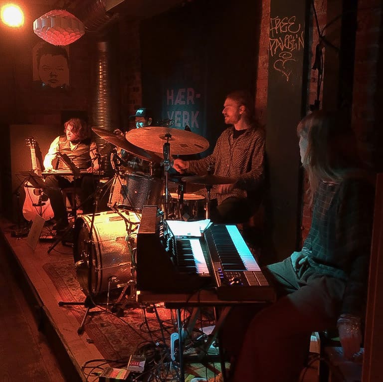 Trommeslager Bjørn André Syverinsen kommer tydeligere til sin rett på scenen. Han får bølgene i stoffet til å toppe seg og skumme, før et kort mellomspill fra trombonist Emil Bø, underbygget av diskret perkusjon, tar oss inn i «Eteik». Den gir meg assosiasjoner til bandet Villagers, før Bø og synthist Anna Ueland klipper den forestillingen i to og åpner samtidsutstilling. Det låter smakfullt, smart og fengende, og det fortsetter det å gjøre helt inn i dansemusikkens skakke verden. Kafe Hærverks enslige discokule spinner sakte mens KRISE lager alternativ fredagsfest med «Septimal dans». Etterhvert løfter kvartetten seg selv inn i grov og fribåren lengsel. Eller kanskje det er jubel vi hører, eksotiske sig og skarp eleganse. Jeg har nevnt den før, og jeg kjenner den igjen, følelsen av å bli bragt tilbake til artrockens glansdager og til områdene for Jim O´Rourkes fruktbare idéer. Komponist og gitarist Kristian Enkerud Lien har omtalt Gastr Del Sol i kjærlige vendinger. Det lar seg forstå. Jeg syns KRISE forholder seg ytterst smakfullt til egne påvirkningskilder og lykkes med å gå opp egne spor.