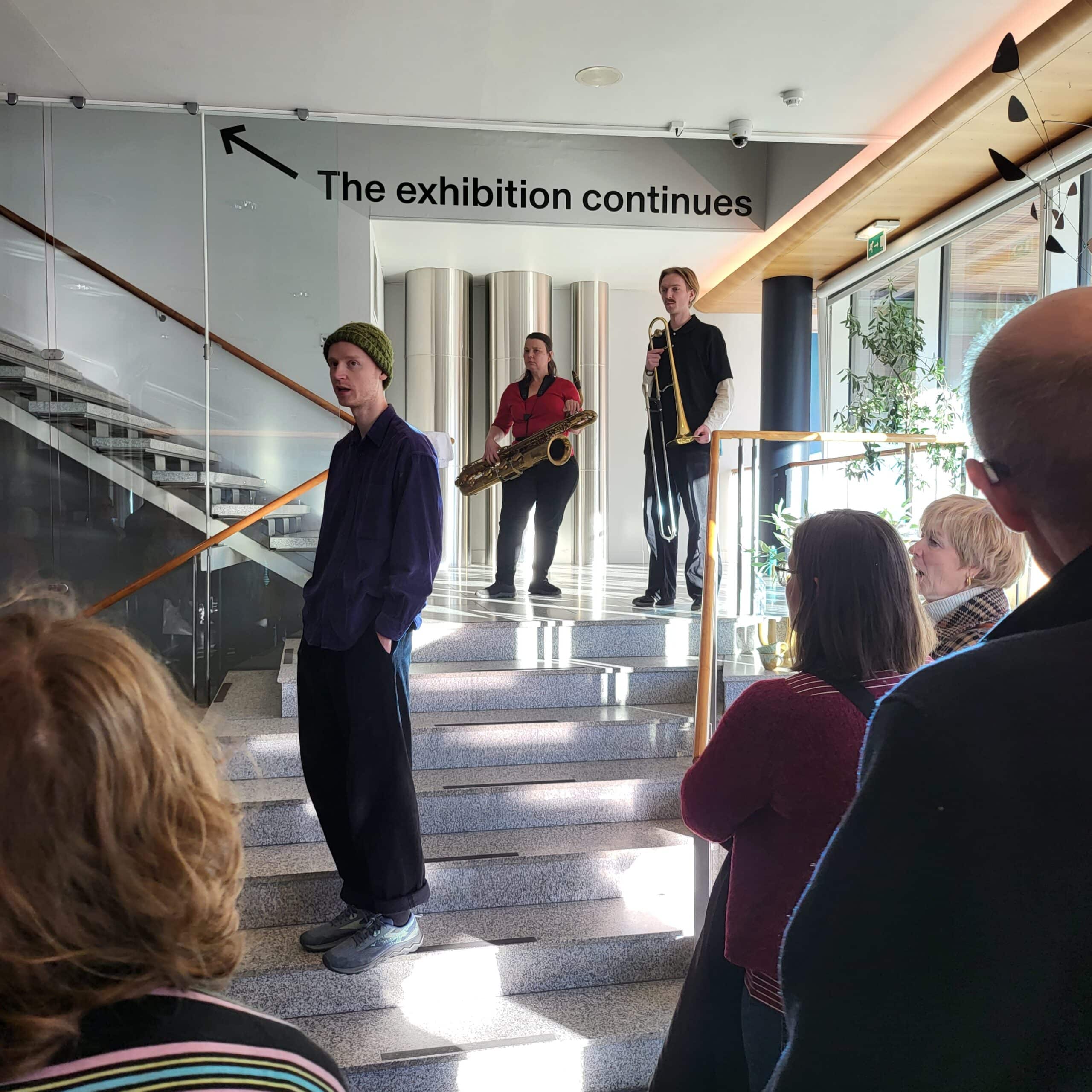 Kunstløypa ble avsluttet i det vakre Lillehammer Kunstmuseum der Erling Viksjøs originalbygning smelter så godt sammen med Snøhettas tilskudd (til inspirasjon for alle arkitekturopprørere). Galumphing Duo består av de gode vennene Shannon Mowday på stor saksofon og Jørgen Bjelkerud på lang trombone. De måtte konkurrere med sorlet fra lørdagskafeen, men stjal likevel de oppmøtte oppmerksomhet med sitt dypt jazzikalske og lekne samspill, der de virkelig utfyller hverandre. De klarte til og med å få en låt fra Mowdays store bestillingsverk for Bergen Big Band ned til kun to stemmer, med hell.