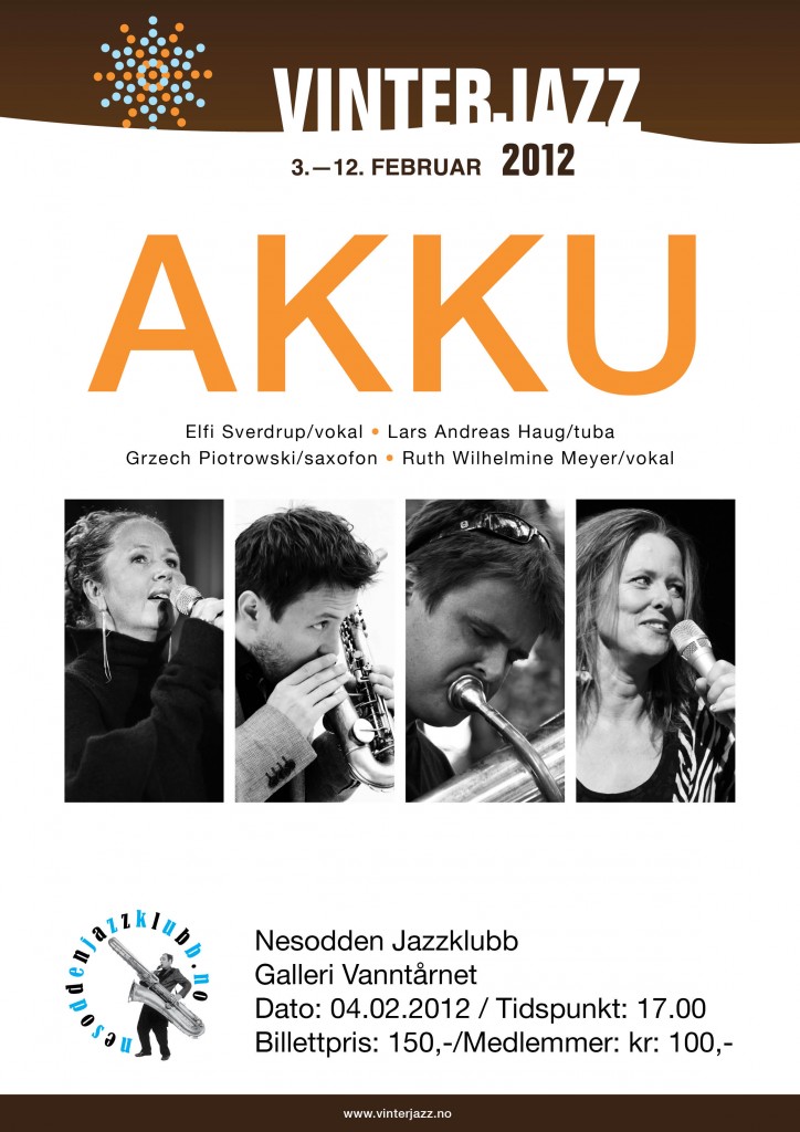 Vinterjazz 2012: Nesodden jazzklubbs andre arrangement dette året er en del av den nasjonale festivalen Vinterjazz. Til Vanntårnet denne lørdag ettermiddagen kommer derfor AKKU. AKKUs lydmateriale har sitt fundament i sangtradisjoner på Nordkalotten: bl.a. Nord-Canada,