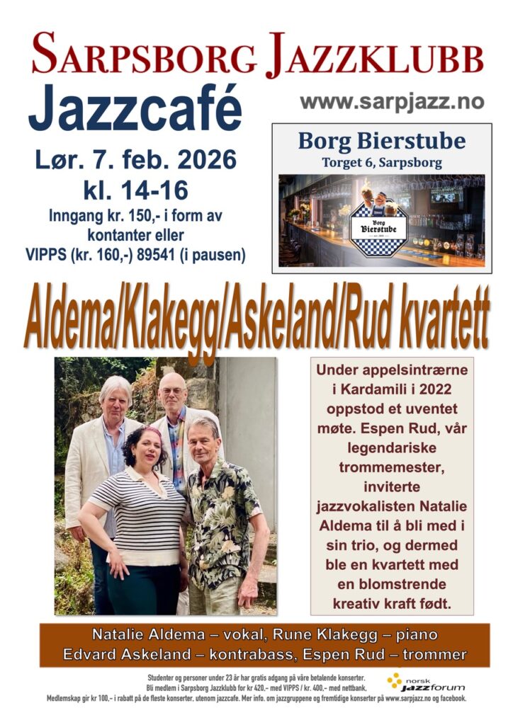 Lørdag 07. feb 2026 kl. 14:00 Aldema/Klakegg/Askeland/Rud kvartett Sarpsborg Jazzklubb / Borg Bierstube Sarpsborg