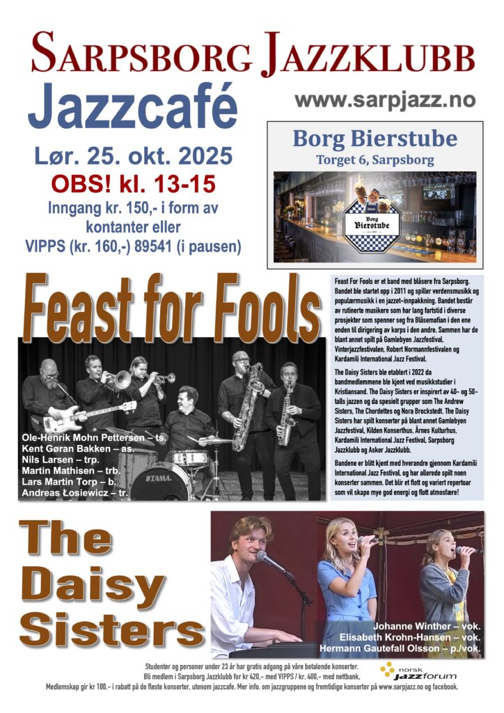Lørdag 25. okt 2025 kl. 13:00 Feast for Fools og The Daisy Sisters Sarpsborg Jazzklubb / Borg Bierstube Sarpsborg