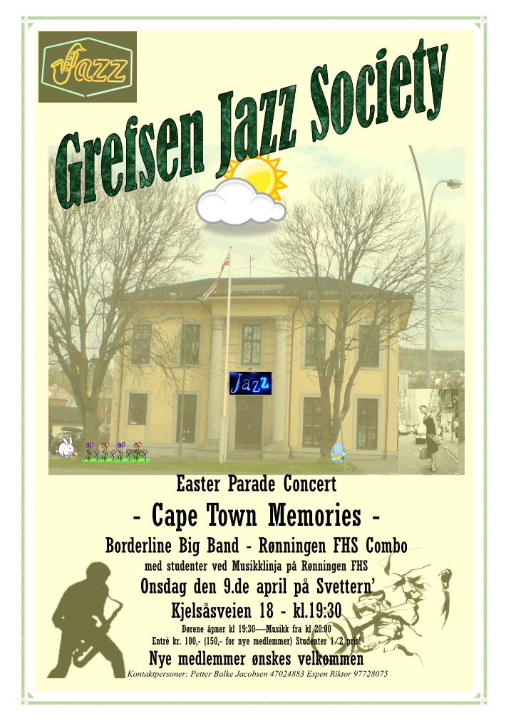 Nok en gang har vi den glede å kunne invitere til jazzkveld på Svettern’. Denne gangen har vi fått med oss et knippe musikere fra Jazzlinja på Rønningen Folkehøyskole som dels på egenhånd, dels i samarbeide med vårt husorkester Borderline Big Band, vil presentere musikk inspirert av deres nylig avsluttede studietur til Sør-Afrika. Det blir ellers et variert program med mindre ensembler, storband og vokalinnslag. Det hele bundet sammen av vår musikalske promotor Arne Hiorth. Hør hans nyeste CD; «The Kingdom Within», tilgjengelig i velassorterte plateforretninger.