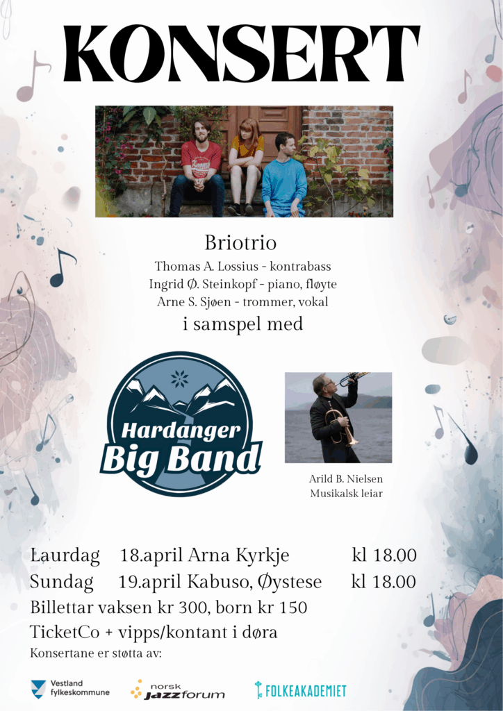 Dette er ei once in a lifetime oppleving! Eit spanande prosjekt, der Briotrio sine låtar kjem i ny drakt, med stort ensemble.. Her snakkar me 2 trommesett, 2 piano, vokal, kontrabass, gitar, trompetar, trombonar og saksofonar. Og for ikkje å gløyme alle dei 3 frå Vestland som har vunnet Norsk jazzforum sin storbandpris: Ingrid Øygard Steinkopf, Arild B Nielsen og Michael Barnes!