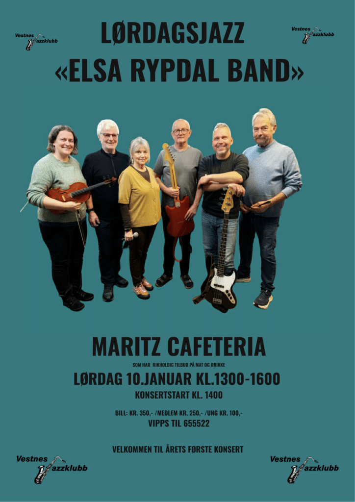 Vi starter opp 2026 med LØRDAGSJAZZ på MaRitz Cafeteria med Elsa Rypdal Band! Vi har rett og slett gitt oppgava til rådyktige musikalske i innbyggere her i Vestnes kommune som har tatt dette på strak arm og danna ELSA RYPDAL BAND! Dette blir gøy og vi gler oss!