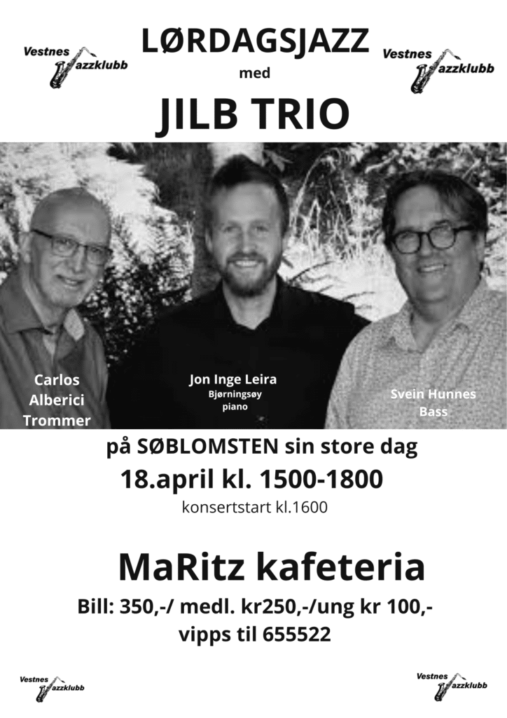 Vi ønsker JILB trio velkommen! Bak tittelen JILB trio skjuler initialene John Inge Leira Bjørningsøy seg. Han er Geitebonde og organist i Ørsta og en meget god pianist. Stikkordet til John Inge er allsidighet, både i sjanger og uttrykk. I trioen har han med bassisten Svein Hunnes og Carlos Albereci på Trommer. De framfører sine favorittlåter, som er alt fra Oscar Peterson til Jan Eggum, i tillegg til egenprodusert musikk. Det er berre å glede seg!