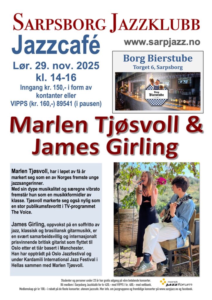 Lørdag 29. nov 2025 kl. 14:00 Marlen Tjøsvoll & James Girling Sarpsborg Jazzklubb / Borg Bierstube Sarpsborg