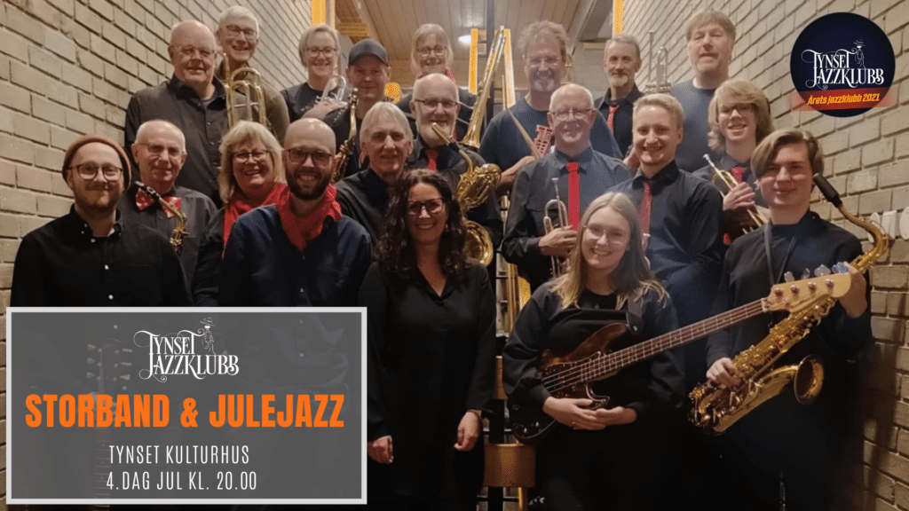 Let it snow, Winter Wonderland, When you wish upon a star: Tynset storband hygger seg, og deg, med swingende julemusikk og storbandjazz 4. dag jul. Storbandet består av en solid gjeng med unge og gamle musikere fra Fjellregionen. Repertoaret er klassiske storbandlåter med og uten vokal, og det garanteres musikalske overraskelser ulike besetninger. Det loves også lave skuldre og høy kosefaktor! Her får du garantert julestemning!