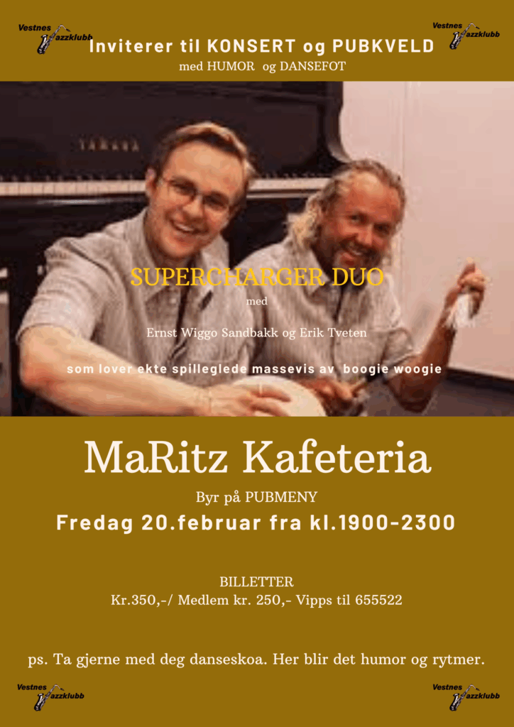 SuperCharger Duo spilles dansbar og publikumsvennlig New Orleans-inspirert musikk, boogie woogie m.m., med stortalentet Eirik Tveten, piano, (26 år) fra Tønsberg og ringreven Ernst Wiggo Sandbakk, trommer.