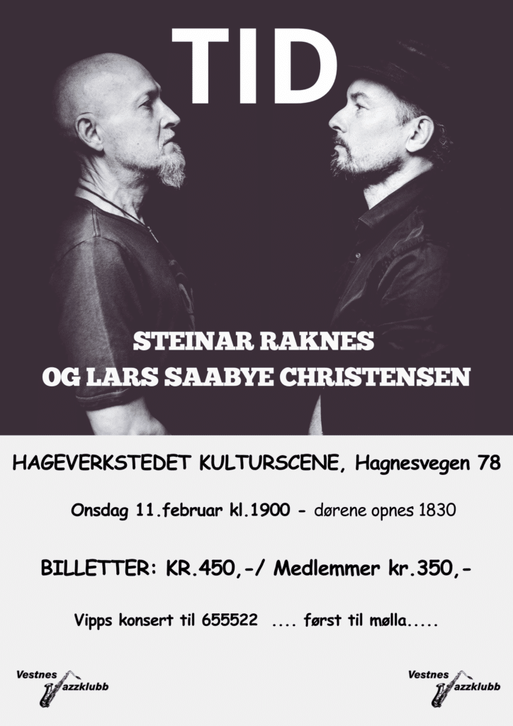 TID Steinar Raknes (kontrabass & vokal) Lars Saabye Christensen (poesi) Ny musikk kommer på plate og konsert, fra tekster av Lars Saabye Christensen og låter av Steinar Raknes. I et års tid har Raknes og Christensen jobbet sammen om plata «Tid», som kommer i september -25. Dette er låter som handler om tid; tiden vi lever i, tiden vi har, tiden vi får, tiden vi har igjen og tiden kloden har igjen. På konserten fremfører Raknes låtene fra plata, og Christensen leser, i samspill med Raknes.